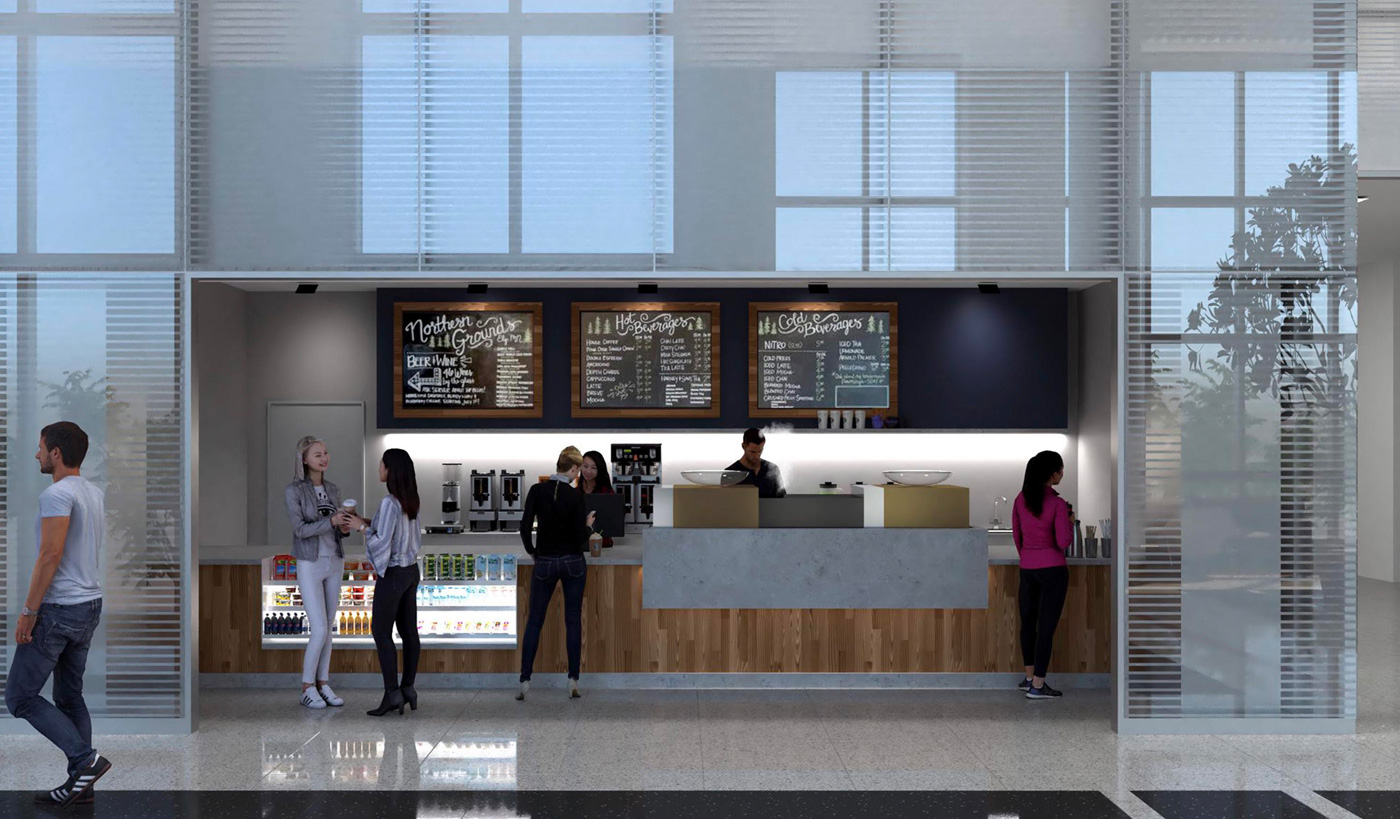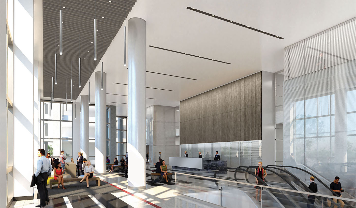 Striking new building entrance and impressive two-story atrium lobby present a bold sense of arrival.